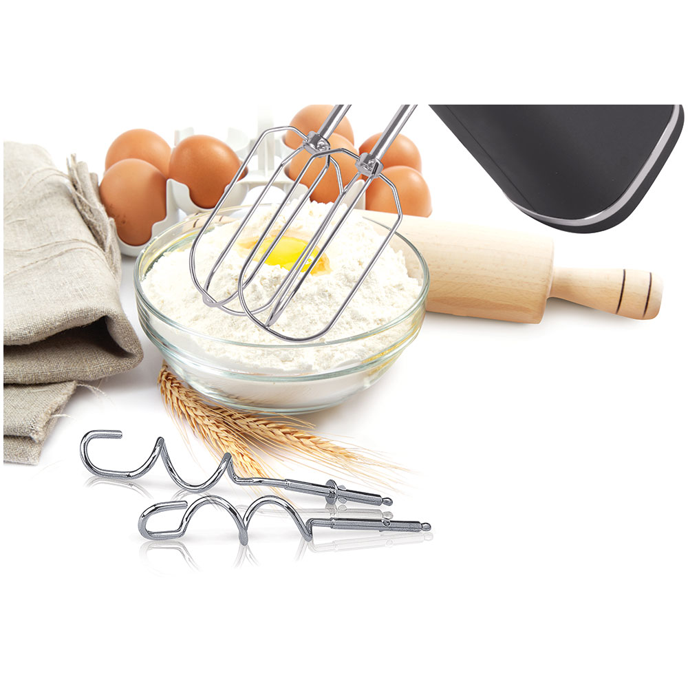 Миксер Polaris PHM 5014 поставляется в комплекте с венчиками для взбивания кремов и яиц, а также со специальными приспособлениями для замешивания густого теста. Прибор подходит для выполнения любых работ – в нём предусмотрено пять скоростей вращения мотора, а также турбо-режим, кратковременно повышающий мощность.