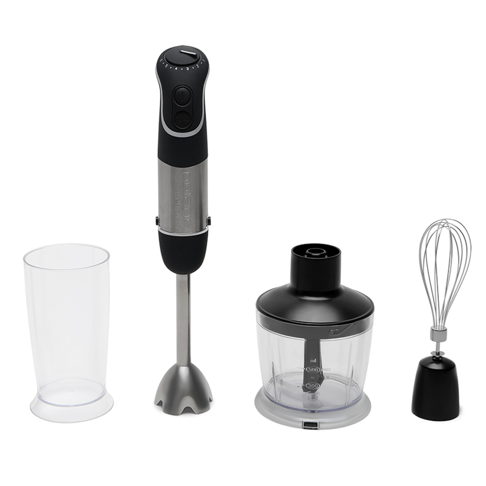 В комплект поставки входит измельчитель, а также насадка для смешивания и венчик. Устройство также укомплектовано мерным стаканом, облегчающим приготовление блюд по сложным рецептам.