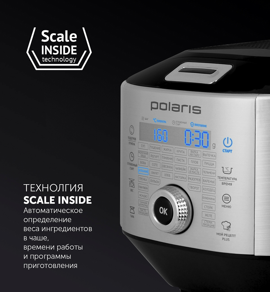 Scale inside Technology. Автоматическое определение веса ингредиентов в чаше, времени работы и программы приготовления.