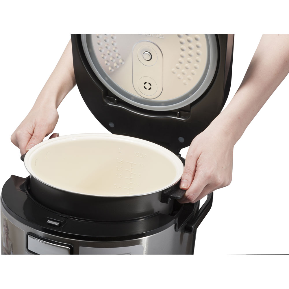 Кроме того, мультиварка Polaris PMC 0523AD оснащена 23 автоматическими программами. В каждой из них предусмотрена функция «Отложенный старт» до 24 часов. Для приготовления пищи используется технология 3D-нагрева. Съемная 5-литровая чаша обладает антипригарным и антибактериальным керамическим покрытием. На чаше есть небольшие ручки, за которые можно безопасно достать горячую емкость и не обжечься. Мультиварка Polaris PMC 0523AD снабжена отменой автоподогрева, сенсорным управлением на крышке и трехцветной подсветкой экрана, которая меняется при работе прибора. К мультиварке Polaris PMC 0523AD прилагается стандартный набор аксессуаров и йогуртницы.